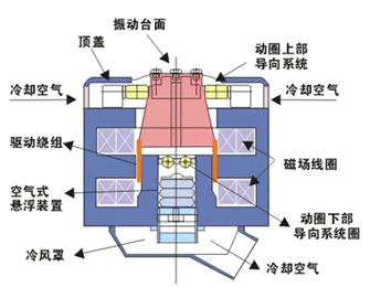 运动部件:电动振动台运动部件是由台面、动圈(含骨架)、动圈的悬挂连接件、柔性支承、电器连接件和冷却连接件组成的运动系统。